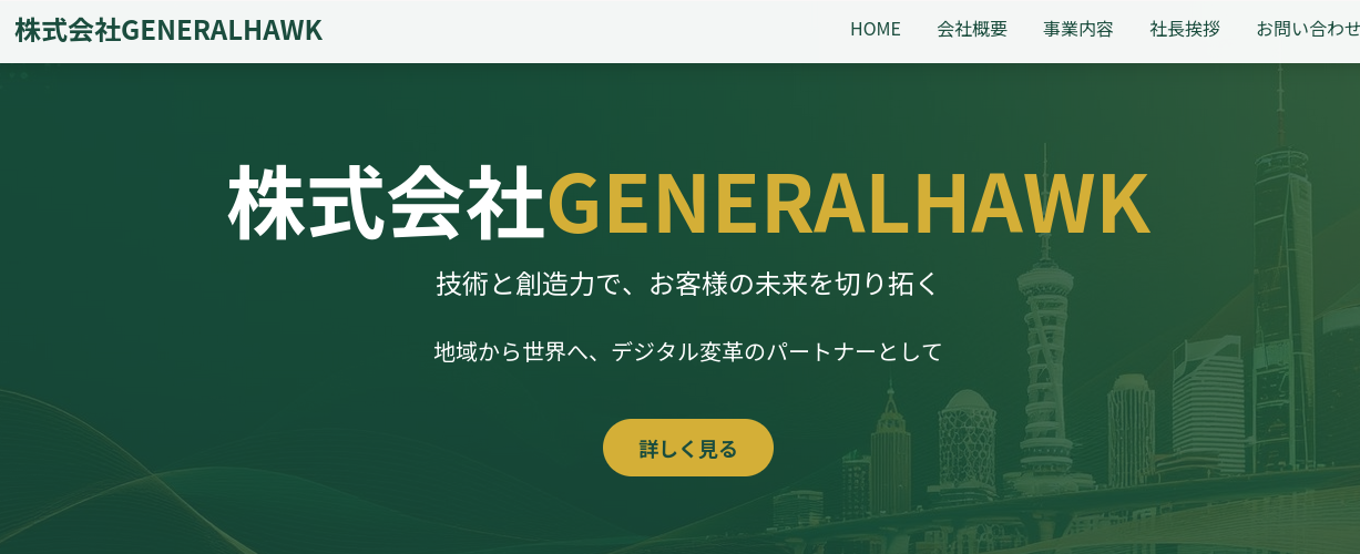 - 社名:株式会社GENERALHAWK。設立日2016年5月11日。所在地:神奈川県伊勢原市東大竹1-21-3。代表取締役:加藤 隆伸。従業員数は非常に少数(ウェブサイト上「3名」という記載あり)です。