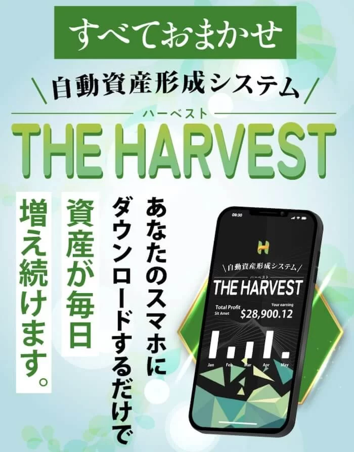 「THE HARVEST」は、スマホやLINEを通じて登録・参加すると、“完全自動で資産が増える” という仕組みを謳っています。広告では以下のようなポイントが挙げられています。